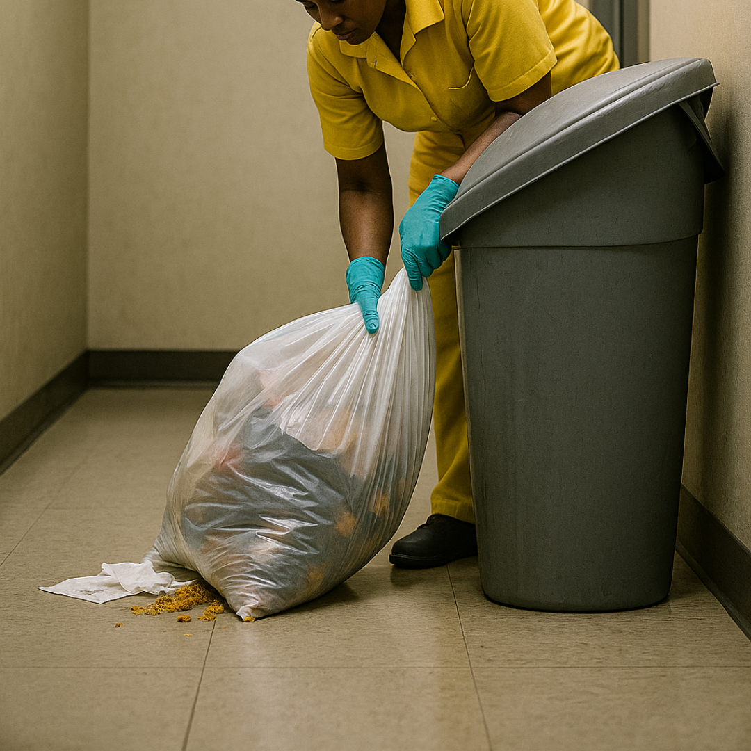 - Desconforto para a equipe de limpeza, que precisa lidar com excesso de trocas ou sacos sobrecarregados