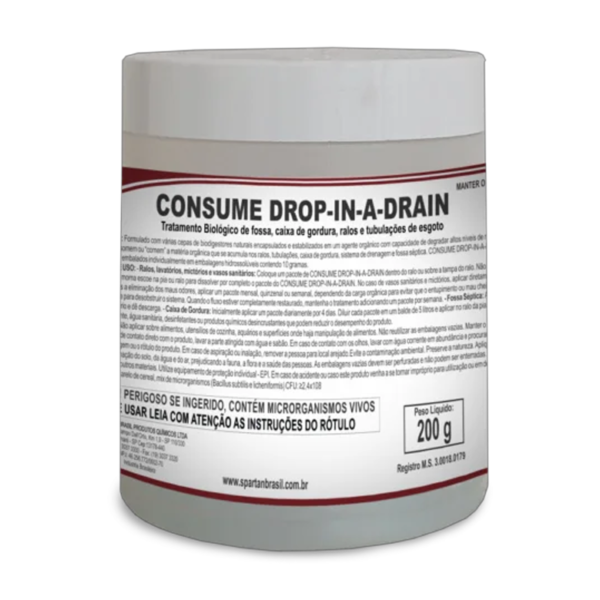 Consume Drop-In-A-Drain é um tratamento biológico para fossas, ralos e caixas de gordura que elimina odores e previne entupimentos por meio da degradação de resíduos orgânicos.