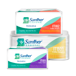 Na linha de papéis toalhas da empresa Santher, é possível escolher entre opções como folha quádrupla, folha simples, folha dupla, folha tripla e com mais de 2 dobras.