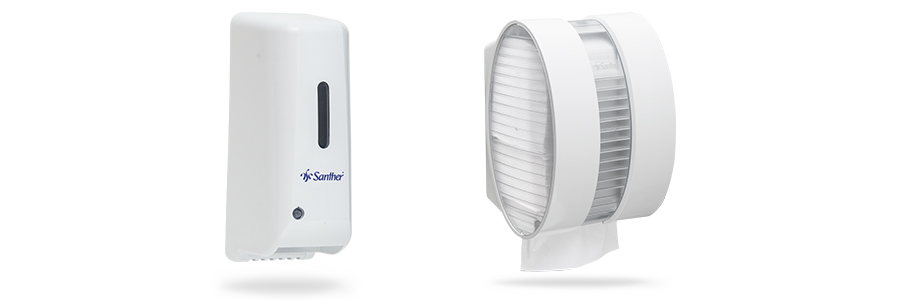 Além do álcool gel, um dispenser de sabonete, como o DSD08, (com válvula de distribuição inteligente) e um dispenser de papel toalha, como o DTD10 , ambos da Santher, tornam a higiene completa para as mãos.