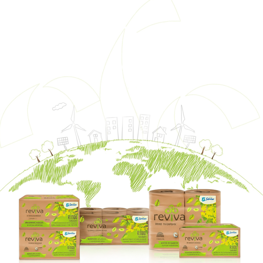 A linha REVIVA da Santher, por exemplo, fabrica papel toalha a partir de embalagens longa vida recuperadas, evitando o descarte em aterros e o uso de madeira.